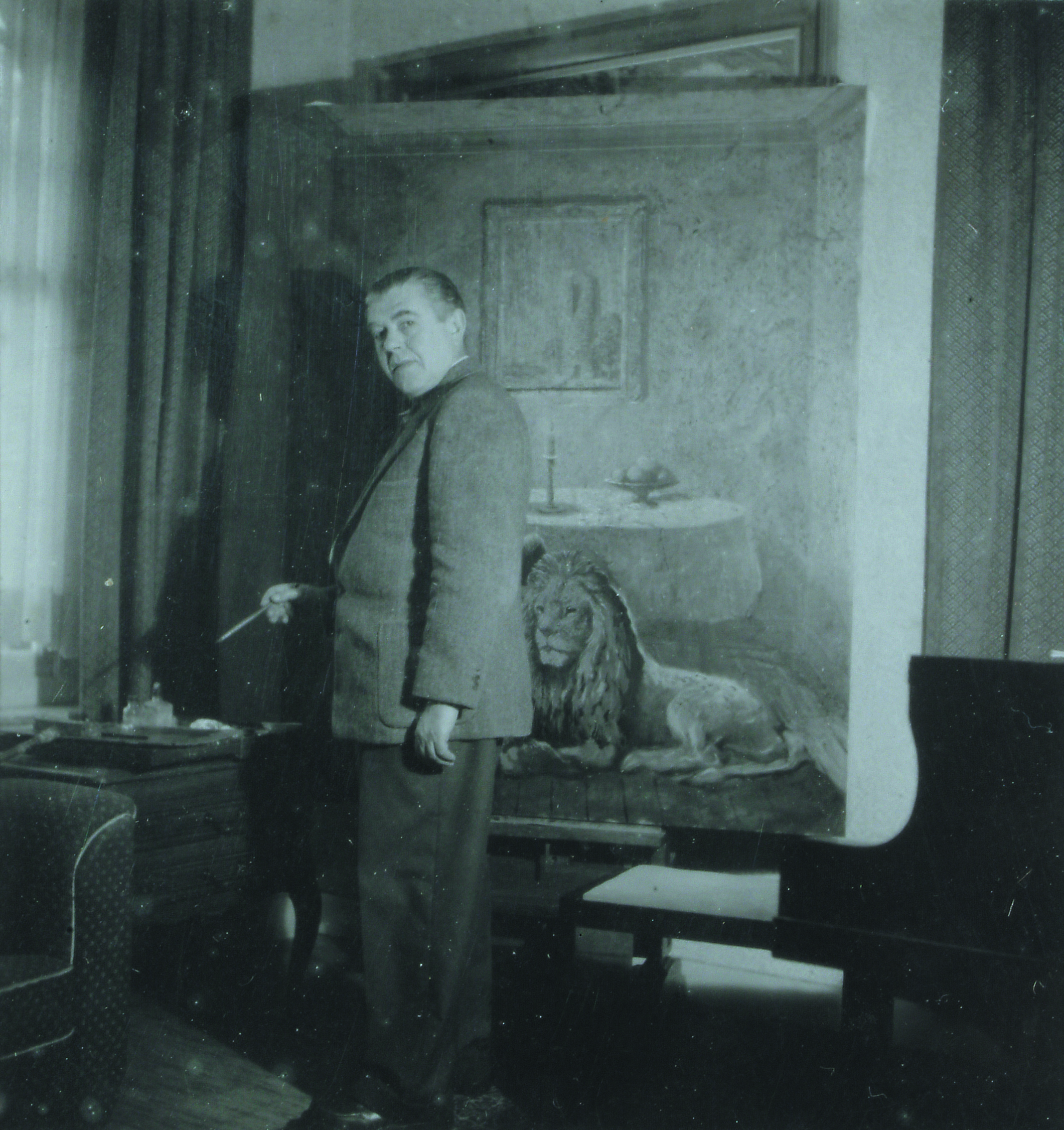René Magritte assis devant "Les deux mystères"(1966) en cours de réalisation